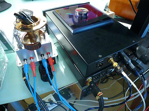 One brief comment on the innards. We always take photos of them. The top plate came off easy enough with the two minuscule output transformers attached. Alas, the flying leads which connect that assembly to the tube circuit board were too short to make for much of a photo op. Suffice to say that the section beneath the transformer cans was fully enclosed in a metal shield to not show anything of significance. The volume control was of the smoothly variable rather than stepped sort, the enclosure got nicely roasty and bananas only may apply on the speaker connections. The included UK-style 3-prong power cord was fitted with a 2-prong Schuko travel adaptor for instant plug 'n' play, the amp itself redundantly protected inside a thick foam clam shell. Receiving the amp from Hongkong and getting it hooked up to play, all potential international issues had been nicely solved in advance. Great start. |
