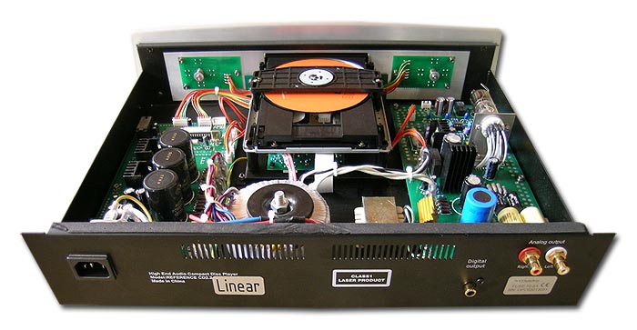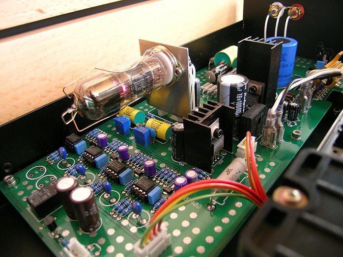 The substantial top cover -- readily removable via 4 hex bolts to gain access to the spring-loaded triode -- is adorned with six solid strips of Cherry which add damping and cosmetic appeal. 'round back is the ubiquitous power inlet, an S/PDIF RCA digital output and a 2.35V RMS analog output on high-quality RCAs. Conversion duties are handled by a 16-bit Philips TDA1543 chip while I/V conversion is performed purely passively for "superb transient response without any overshoot". The analog reconstruction filter is J-FET based to eschew opamps. In the spec wars, the 2.2 Linear already seems a winner before any listening commences: a claimed >100dB S/N ratio, <100dB cross talk and THD of < 0.12%. Warranty is 1 year and 90 days on the tube. |