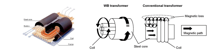A WB power transformer in Esoteric talk (Wound core type transformer with coil Bobbin) "offers highly efficient and outstanding performance for its physical dimensions." The WB power transformer incorporates a reverse assembly of how the steel core is wound to and surrounds the coil. The simplified model above shows the magnetic paths of WB and conventional transformers. "The WB design ensures the shortest magnetic path from the coil because the coil surface and the core surface are at a constant distance at the same radius and the magnetic path generated from the coil fully magnetizes the steel core without any loss. This creates a more constant power output supply. From an audiophile perspective, the end result is similar to the high-end sonic characteristics achieved by tube-equipped integrated power amplifiers."