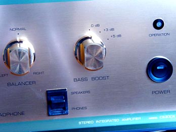 As you can see, the CS-300X is cute little thing that you could easily tuck under your arm. Nicely finished solid ash side panels flank the attractive gold and green two-tone aluminum front panel. The controls from left to right are input (for 5 sources), volume, balance and the surprisingly effective bass boost which allows a mild 3dB and 5dB increase for low volume late night listening. Sweet! Beneath the gold-plated aluminum controls are two plastic switches, one for tape monitoring, the other to toggle between speaker and headphone output. Both switches flank the headphone jack. On the far right is the power switch and status indicator, the latter powered by the EL84s' cathode bias instead of a relay switch. Therefore the LED only lights up when the tubes are warmed up, roughly 10 seconds past turn-on. |