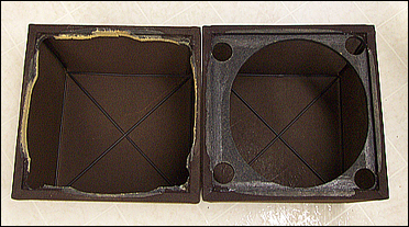 The new black grills looked great but I really like my old brown ones. So I boxed up the blacks and put them away. I got out a jigsaw and in the most ungraceful of ways, enlarged the openings of my old grills to accommodate the larger driver [see below]. The elegance with which they now adorned the newly upgraded speakers completely belied the mess I knew was hidden underneath. I was very pleased. I even found the new contrasting black accent (the driver's mounting plate) somewhat chic. When I was done, I had restored/upgraded a pair of speakers (that in 1983 cost me $1500) with a new set of drivers that run $2995 for a product roughly the equivalent of the Ohm Walsh 5 MkII that sells for $5,000. Does Ohm protect the value of your investment or what? |