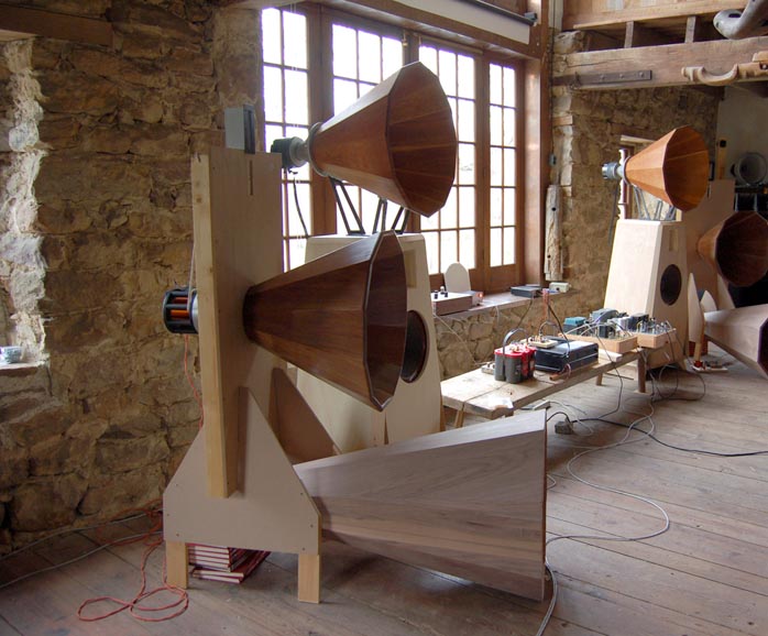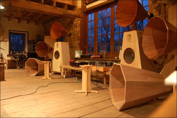 The 2nd (inside) pair of speakers were a plywood prototype of a model AC1 from OMA. This is a three-way design incorporating a 15" Alnico woofer, a ribbon tweeter and an RCA compression driver and the OMA 300Hz conical horn. The production speakers will be solid wood, "...everything we make is in solid wood, horns included." For pics of a production pair, check out the OMA products page. |