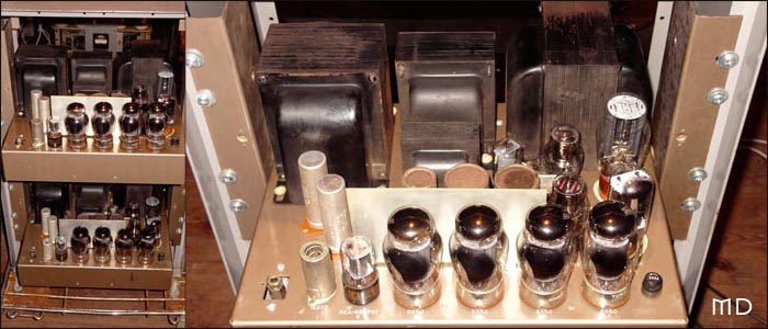 Electronics included the Mill's own amplifier which stands taller than most men. From Jonathan: "The Mill's electronics include a glass-enclosed amp rack housing a homemade driver amp with an AL4 mesh plate in screen grid mode driving a single ended 300B (circuit designed by Paul den Hollander of Leiden, NL), driving the big RCA 845 pp booster amps. The rack is enclosed in glass for safety reasons (the RCA 845 amps were originally in a metal cage with pressure switches to shut off power if the cage was breached). The RCA 845 amps were first used in the Disney Fantasia road show, a legendary production which was arguably the very first time multi-channel super hi fi was attempted. Each amp weighs over 150lbs. Output in class A is a minimum of 60 watts." |